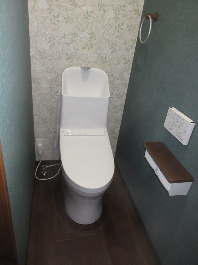 30年程前の洋風便器からTOTOのウォシュレット一体型トイレへリフォームしました。節水型でフチなし形状の便器なのでお掃除もしやすく、床と壁紙も張替え紙巻器やタオルリングも新しくしたので統一感のあるとても素敵なトイレ空間になりました。