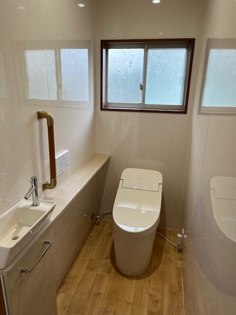 以前はトイレに大便器と小便器があったのですが小便器は使用しないとのことでしたので撤去して、TOTOのウォシュレット一体型トイレGGへ取替しました。手洗器はTOTOのコンフォートシリーズMサイズの手洗器を設置しカウンターをつけました。壁と床は以前はタイルで目地の汚れの掃除が大変だったので、壁は表面が拭きやすいアイカのパネル(セラール)に、床はクッションフロアにしたのでお掃除がしやすく快適なトイレになりました。